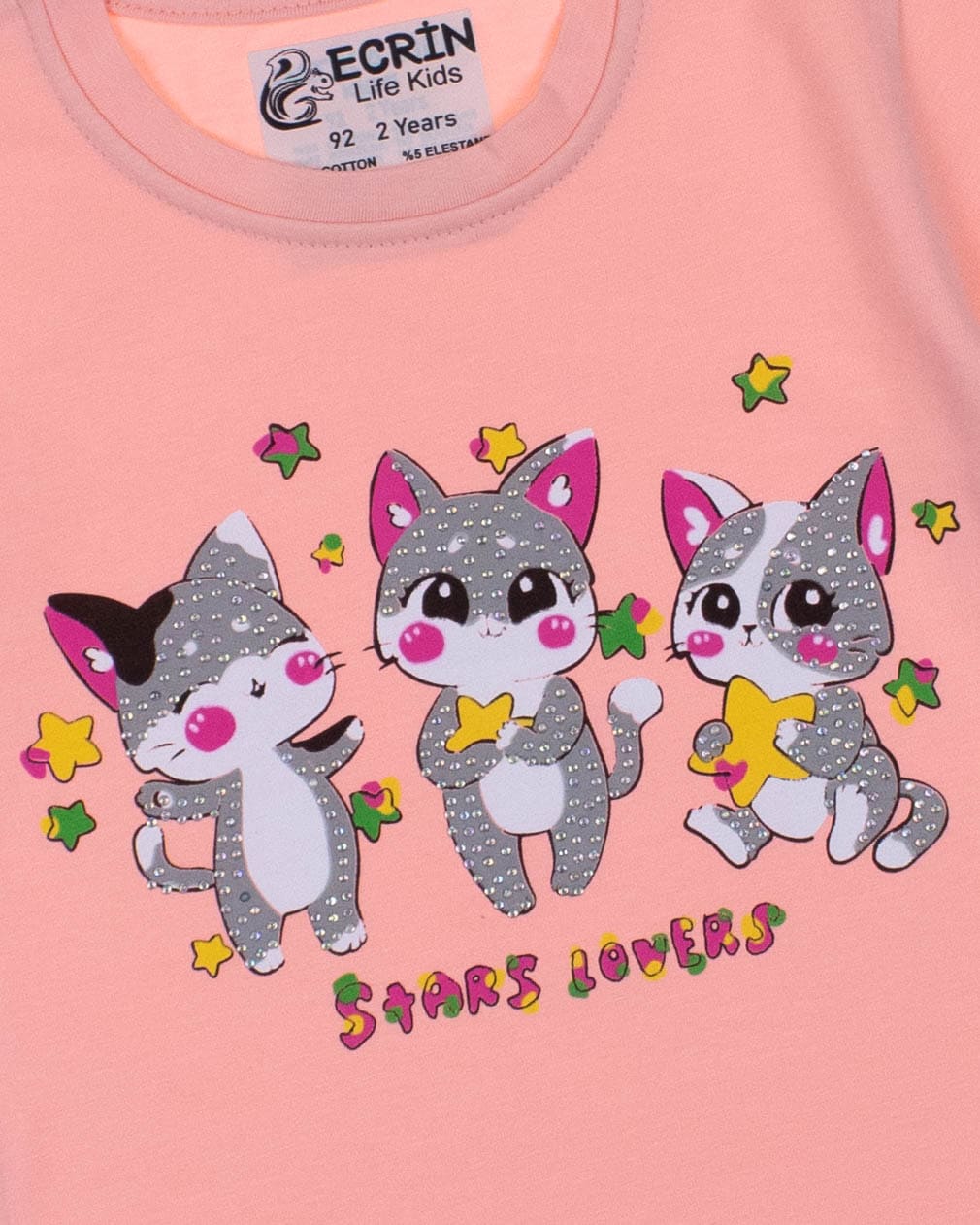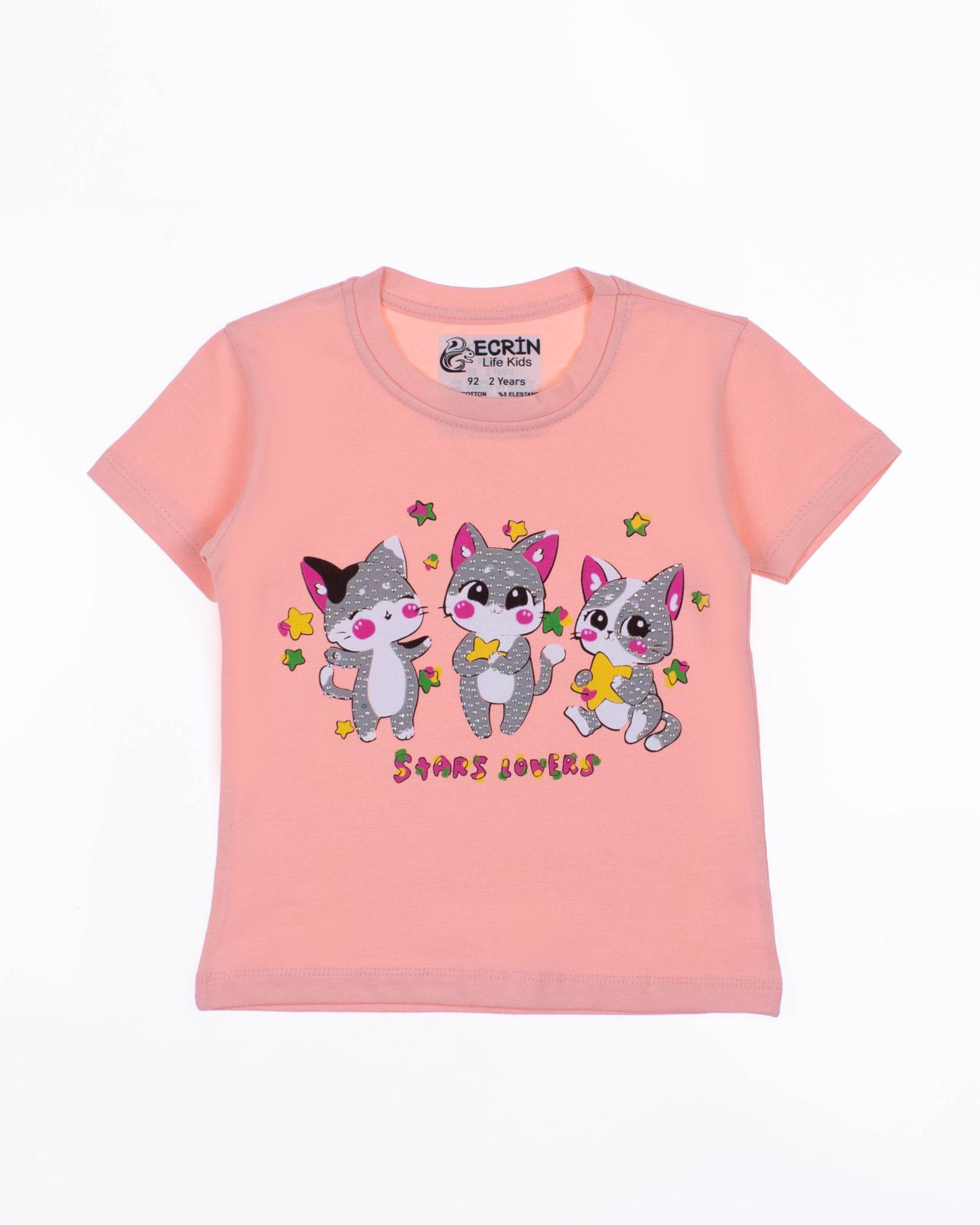 Футболка ECRIN  для девочки оптом, производства Турция. Модель приталенного силуэта с короткими рукавами, милый принт украшен стразами.