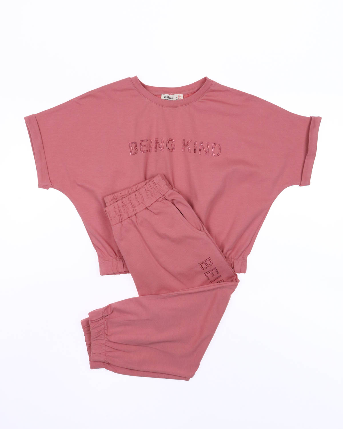 Укороченная футболка на резинке и брюки делают летний комплект оригинальным и стильным. Футболка и брюки декорированы аппликацией из страз.Брюки с боковыми карманами на мажетах. Костюм выполнен из мягкого трикотажа кулирка.