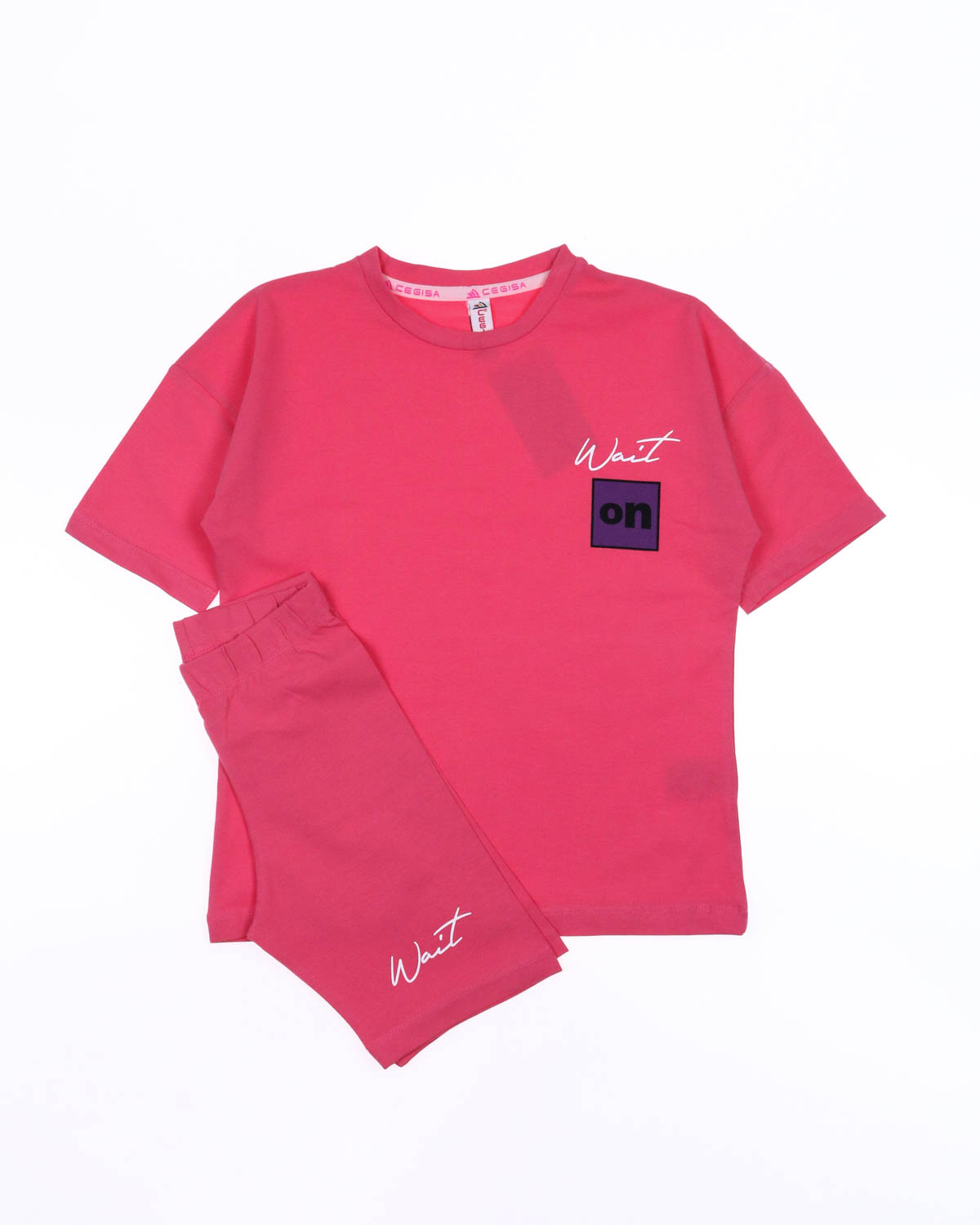 Летний костюм CEGISA для девочки из эластичного трикотажа кулирка. Футболка прямого кроя, со спущенной линией плеча и велосипедки.