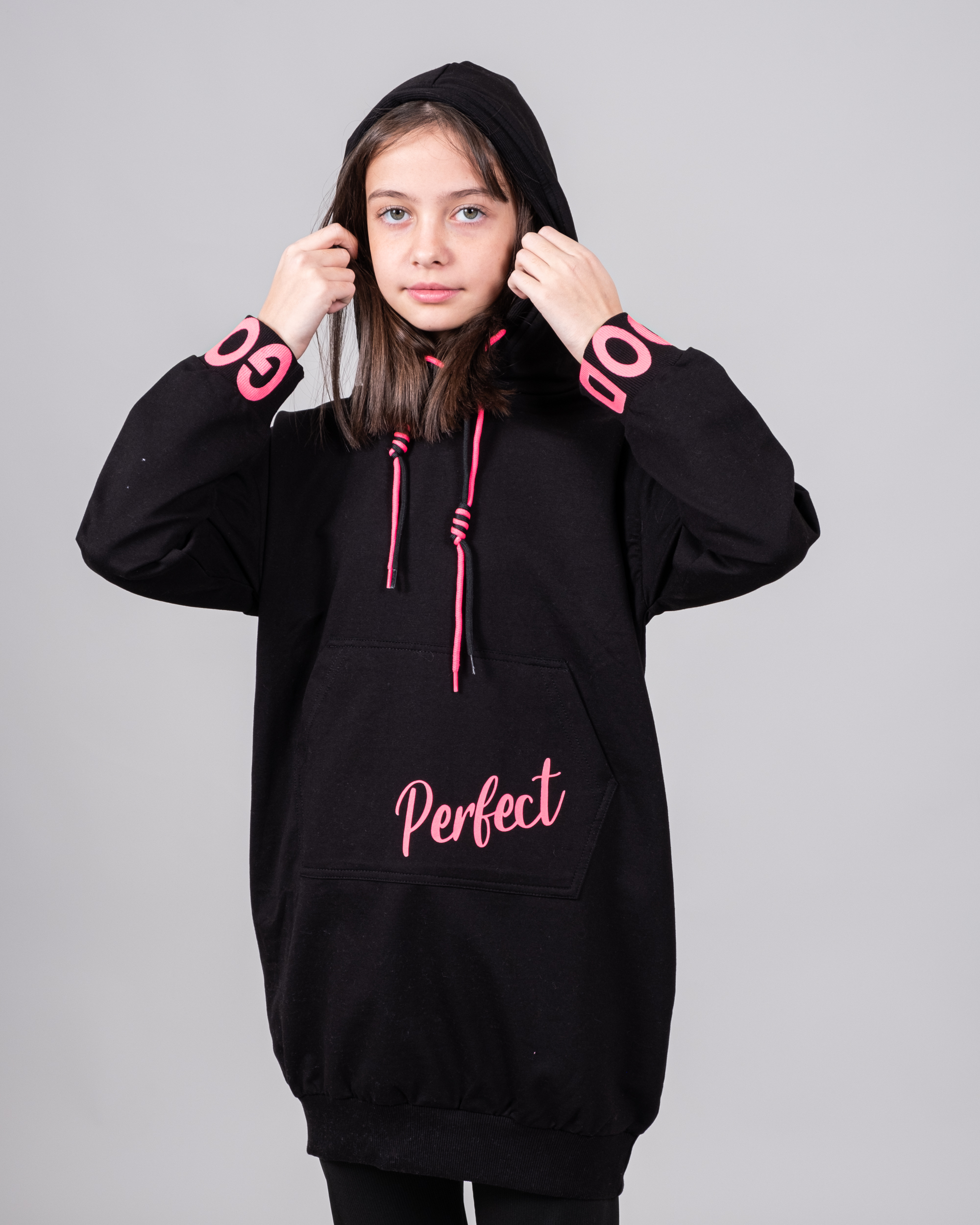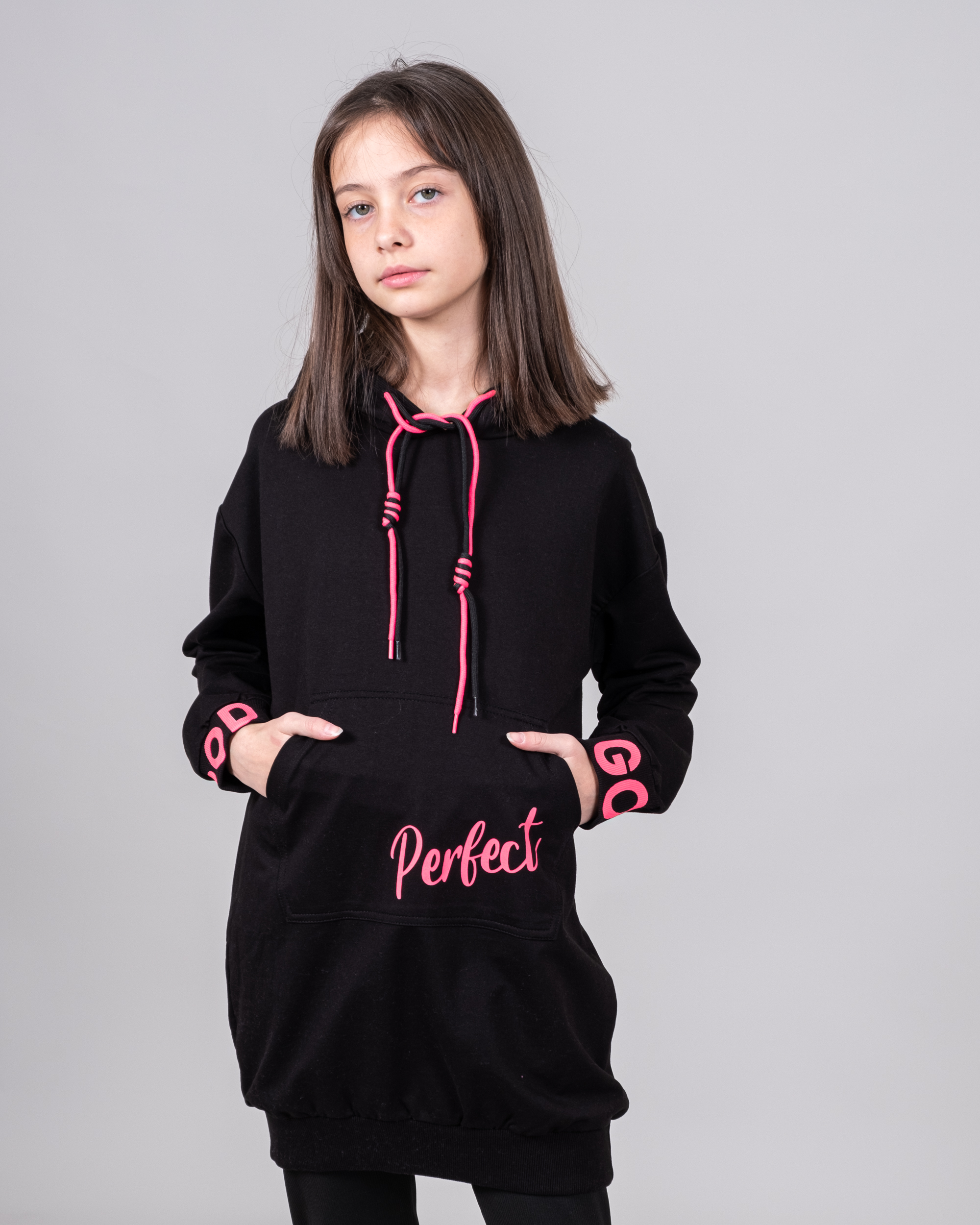 Удлиненное худи CEGISA для девочки выполнено из качественного трикотажа футер (петля). Декорировано яркими шнурками и принтом.