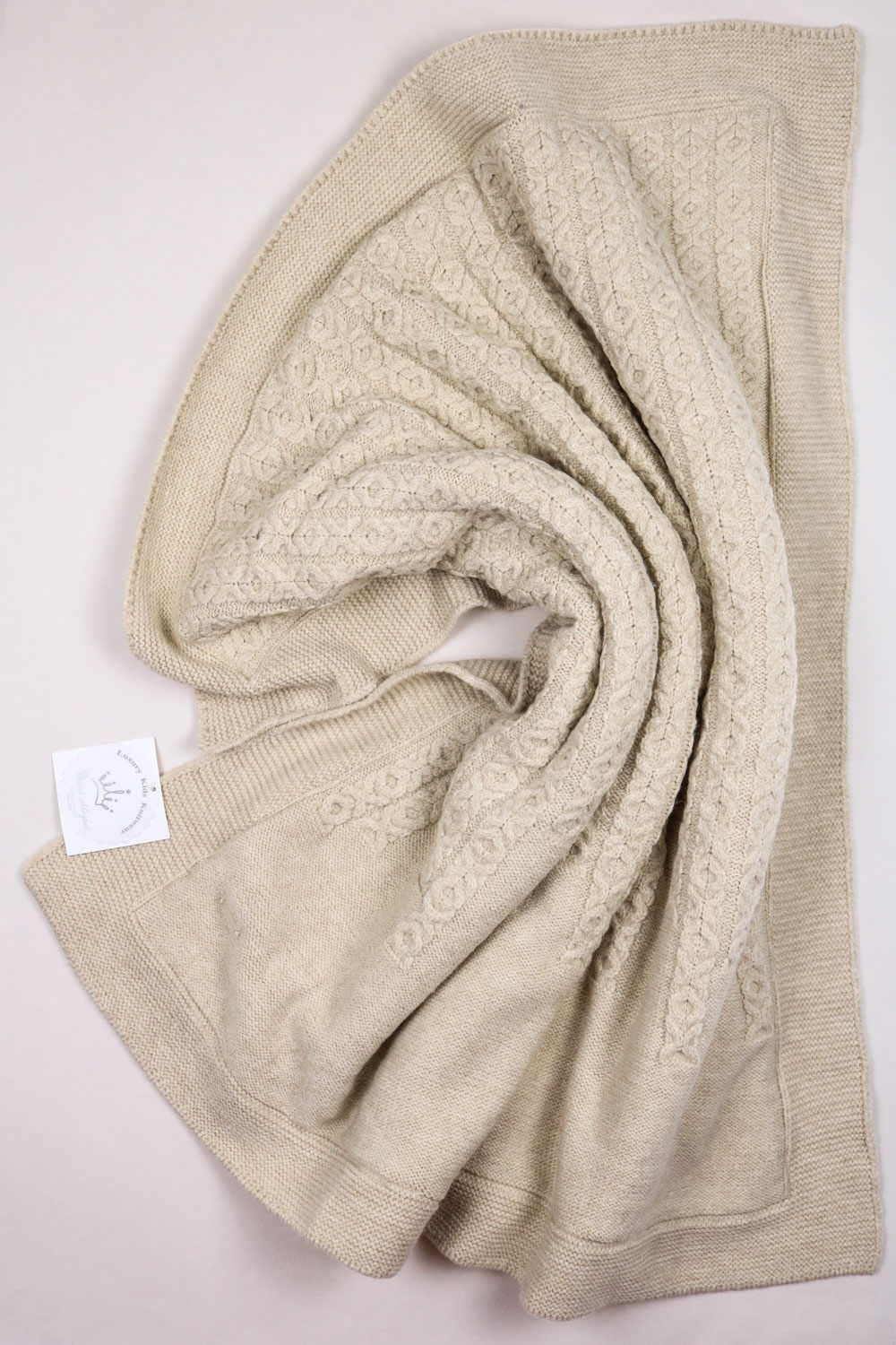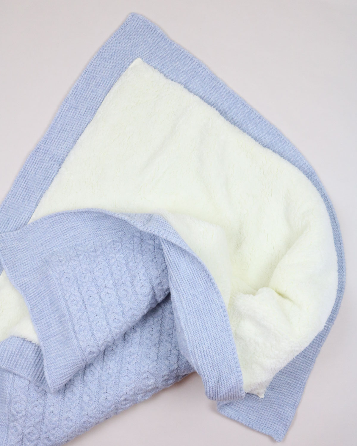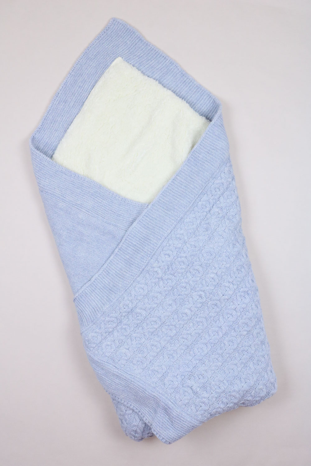 В составе этого пледа 20% шерсти. С лицевой стороны выполнен вязаный узор, а с изнаночной он утеплен подкладом из ткани вельбоа, ее еще называют искусственным плюшем. Она мягкая, теплая и приятная на ощупь.  Под таким пледом малыш точно не замерзнет.