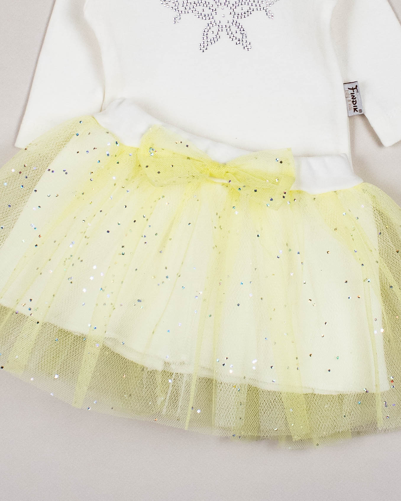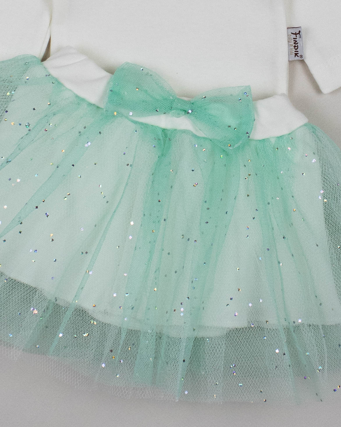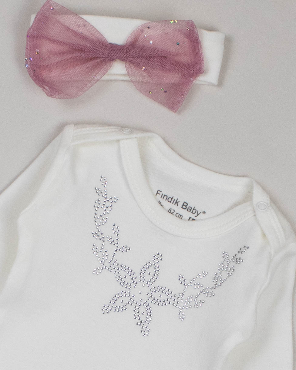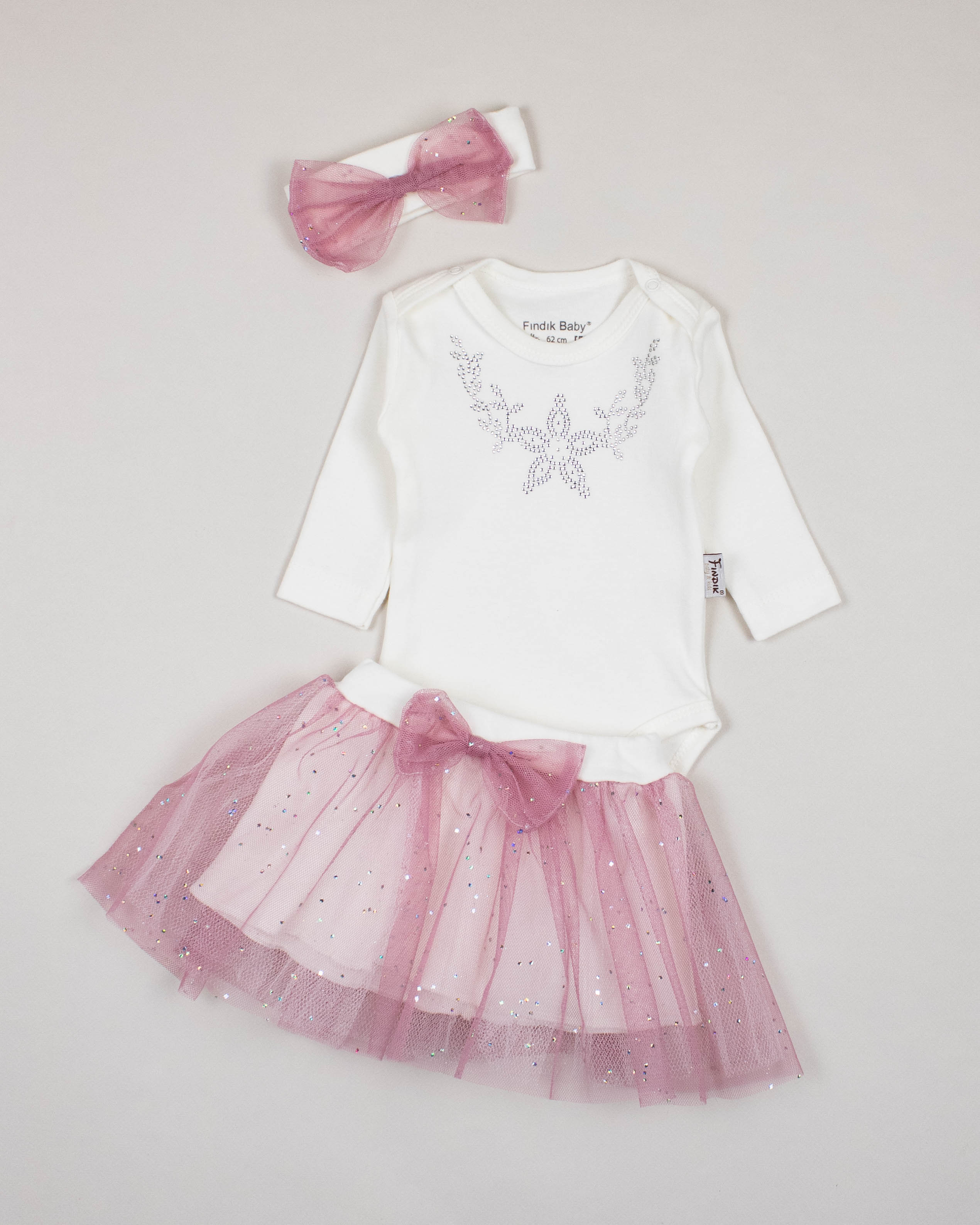 Комплект для малышки FINDIK оптом входит сразу три предмета- боди, юбочка и повязка на голову.