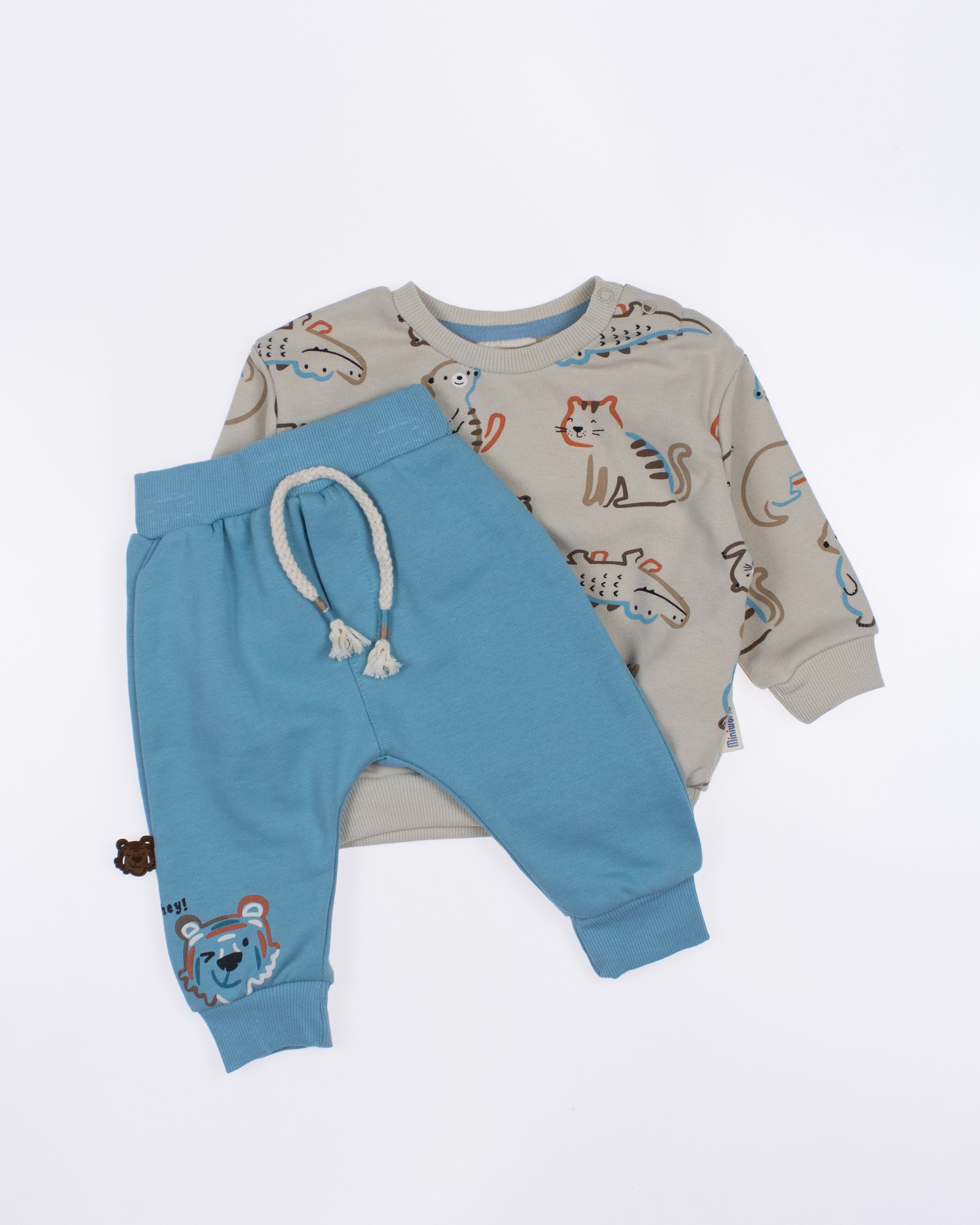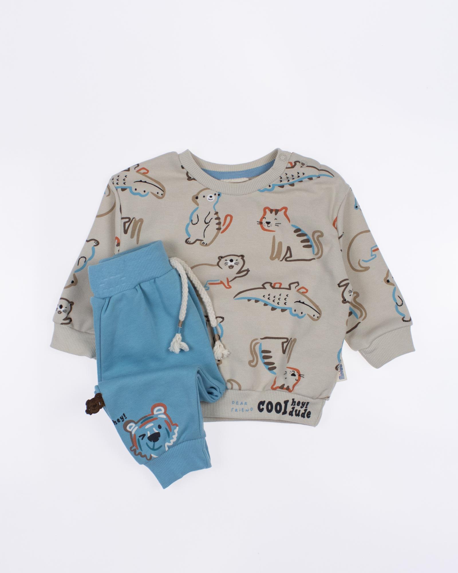 Мы предлагаем оптовые продажи детской одежды производства Турция. Хлопковый костюм  MINIWORLD выполнен из 100% хлопка, что гарантирует комфорт и безопасность для самых маленьких детей. Свитшот имеет удобную застежку-кнопки на плече, что облегчит процесс надевания и снятия одежды. Штанишки с мягкими манжетами на эластичном поясе идеально подходят для ношения с подгузником, обеспечивая свободу движений и комфорт. Детский милый принт на костюме поможет развить фантазию и воображение ребенка, делая его образ ярким и запоминающимся. Костюм MINIWORLD - отличный выбор для маленьких модников и их заботливых родителей. Не упустите возможность приобрести этот уникальный товар оптом по выгодной цене!