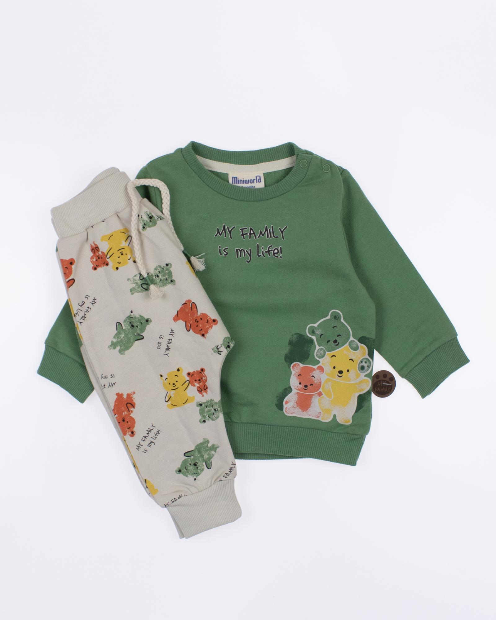 Мы предлагаем оптовые продажи детской одежды производства Турция. Хлопковый костюм  MINIWORLD выполнен из футера (петля), что гарантирует комфорт и безопасность для самых маленьких детей. Свитшот имеет удобную застежку-кнопки на плече, что облегчит процесс надевания и снятия одежды. Штанишки с мягкими манжетами на эластичном поясе идеально подходят для ношения с подгузником, обеспечивая свободу движений и комфорт. Детский милый принт на костюме поможет развить фантазию и воображение ребенка, делая его образ ярким и запоминающимся. Костюм MINIWORLD - отличный выбор для маленьких модников и их заботливых родителей. Не упустите возможность приобрести этот уникальный товар оптом по выгодной цене!